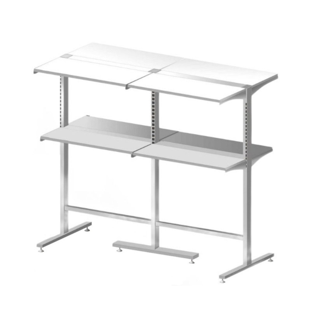 Двухуровневая конструкция без освещения идеально подходит для демонстрации и хранения товаров, не требующих подсветки, и позволяет оптимизировать пространство торгового зала.