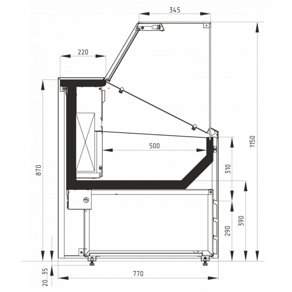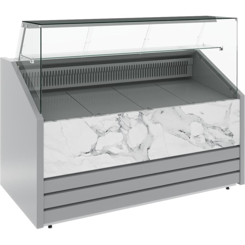 Конструкция витрины включает накопитель для продуктов, поддон для выкладки и регулируемые ножки высотой 20–35 мм. Столешница, зона выкладки, боковые и нижняя фронтальная панели, а также обшивка светильника и испарителя выполнены из стали серебристого цвета. Декоративная передняя панель — из стали, держатель стекла — из нержавеющей стали. Боковины и столешница имеют пенополиуретановую теплоизоляцию.