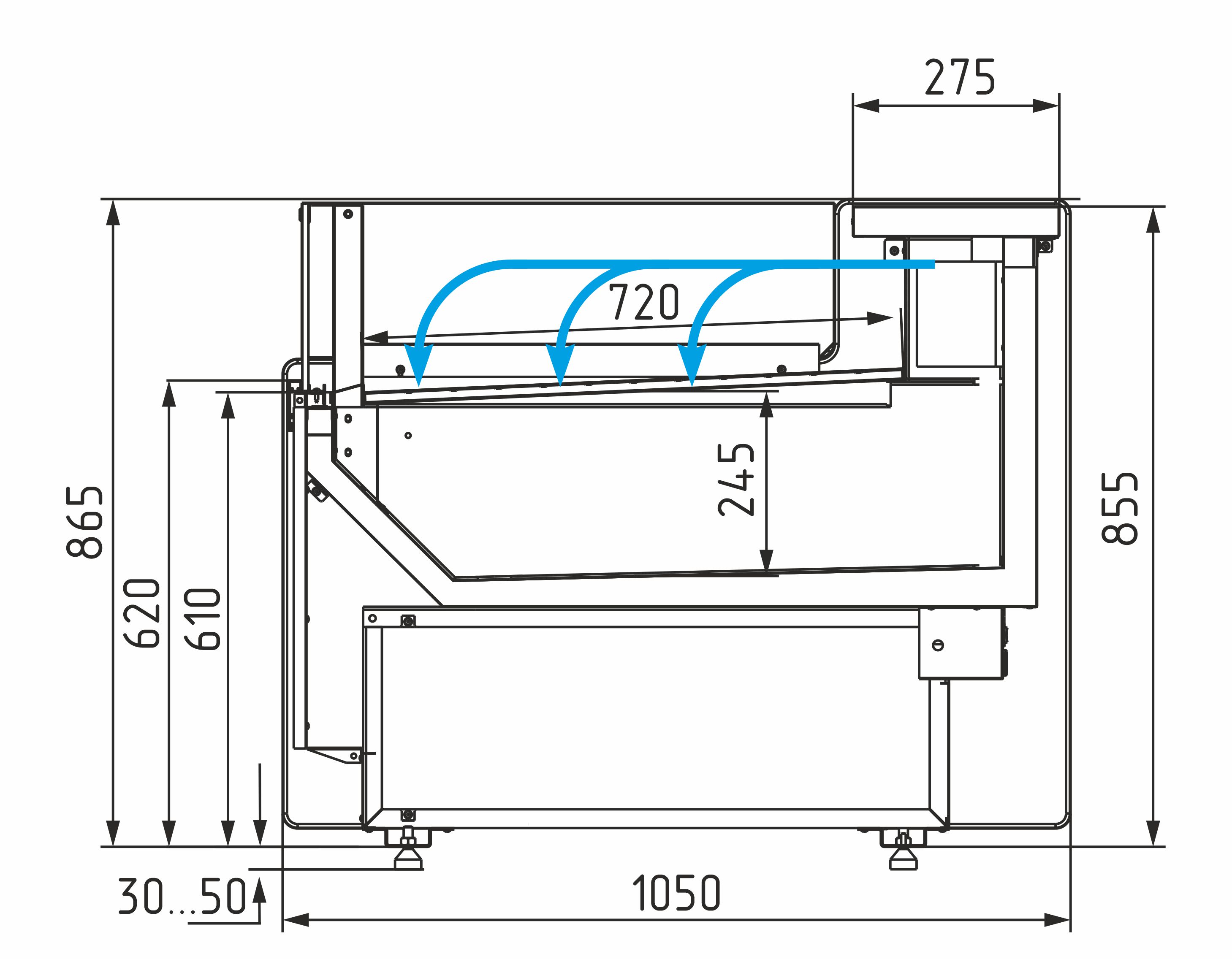 • Фиксируемое фронтальное стекло — открывается вручную и фиксируется для удобной выкладки и обслуживания.